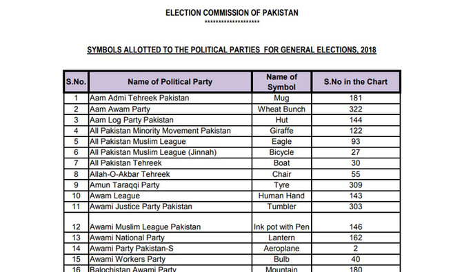 According to the ECP website, the election body has allotted election symbols to 103 political parties. Allah-o-Akbar Party, present in the list at No-9, has been allotted a chair as the symbol.