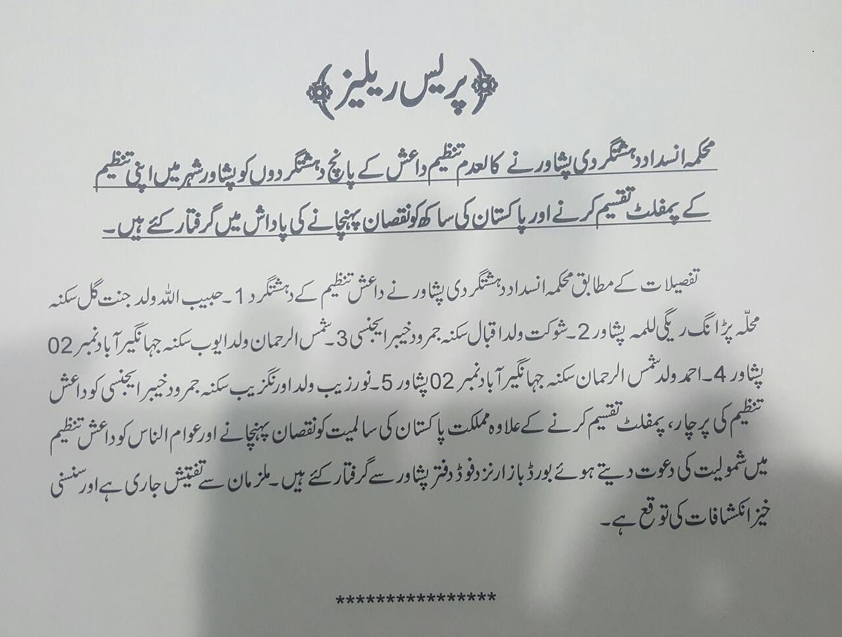 “The terrorists, besides distributing pamphlets of Daesh, were inviting people to the outfit for the cause of damaging integrity of Pakistan.”