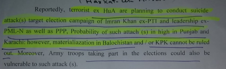“Terrorists of Harkat-ul Ahrar are planning to conduct suicide attacks targeting the election campaign of Imran of PTI and leadership of PMLN as well as PPP, probability of such attack is high in Punjab and Karachi, however, materialization in Balochistan and KP cannot be ruled out,” reads another alert.