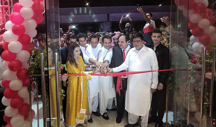 TV and film actors Behroz Subzwari (C), Javed Sheikh, Restaurant General Manager Adnan Al Omare, and actors Behroz Subzwari and Momal Sheikhs (L) inaugurate Bait al Mandi restaurant in Karachi on June, 7, 2019 ( AN Photo)