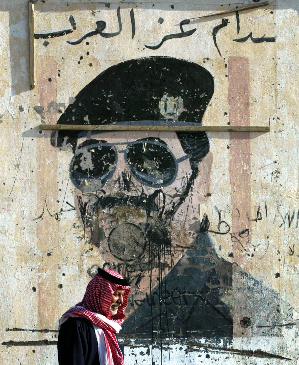 An Iraqi man passes in front of a disfigured mural of ousted president Saddam Hussein titled "Saddam, the glory of the Arabs" at an entrance of the former military training camp in Samawa, 270 kms south of Baghdad, 24 February 2004. (File/AFP)