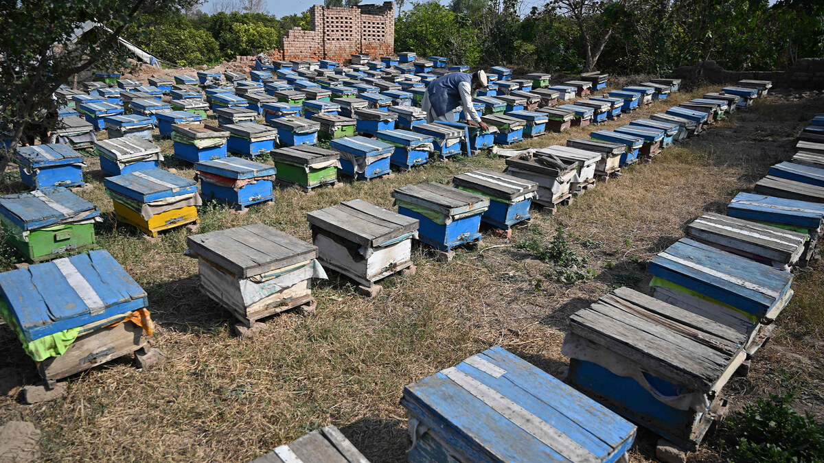 A man working at a honeybee farm at Lak Mor village in Sargodha district of Punjab province on January 30, 2025. (AFP)