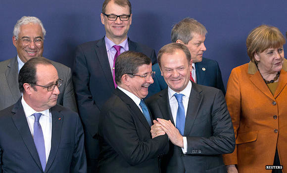 Davutoglu smiled and waved on his way into a final meeting with his counterparts to shake hands on the hard-won deal.