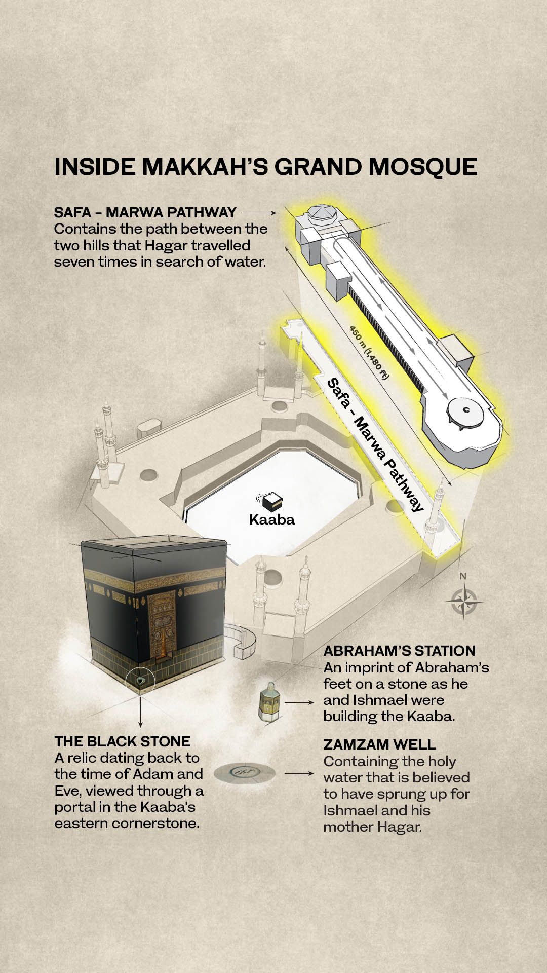 Today, these two hills are joined by a covered gallery connected to the Grand Mosque, a sprawling building that over the centuries has undergone many additions and improvements to accommodate the ever-increasing number of pilgrims performing Hajj, the spiritual journey to the Kaaba, and Umrah, which can be completed at any time of year.