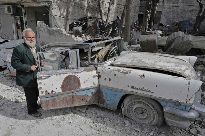 ALEPPO: Car enthusiast Mohammed Mohiedin Anis gazes sadly at a 1955 Buick Super, one of his collection of vintage cars “wounded” in battles that ravaged the northern Syrian city of Aleppo.