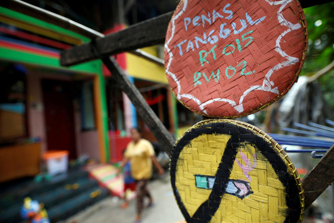 In eastern Jakarta, a row of at least a dozen houses at the Penas Tanggul neighborhood were painted with bright colors in March, with a blue banner hung near the entrance declaring it a smoke-free zone.
