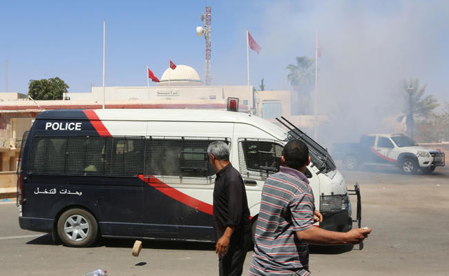 TUNIS: Tunisian security forces firing teargas clashed with protesters on Monday after they burned down two police stations following the death of a young man hit by a police vehicle during protests over jobs in the south.