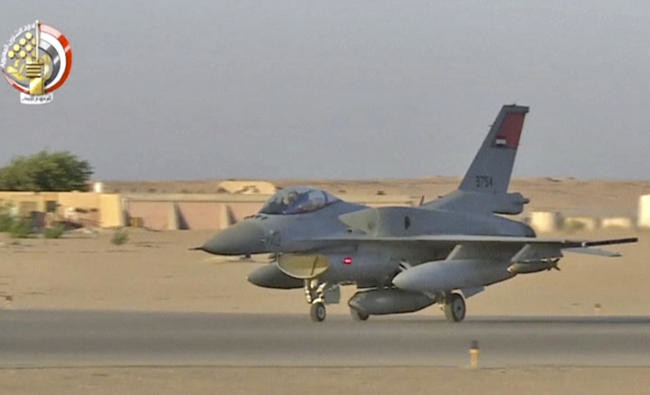The official Facebook page of Egypt’s military spokesman published a video showing warplanes taking off on the mission, as well as footage from the air of vehicles being struck.