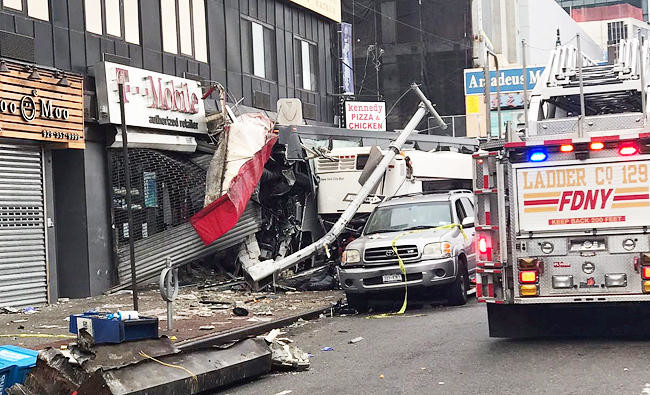 NEW YORK: A charter bus owned by a company with a record of safety problems barreled through an intersection, slammed into a city bus and then plowed across a sidewalk into a building Monday, killing three people.