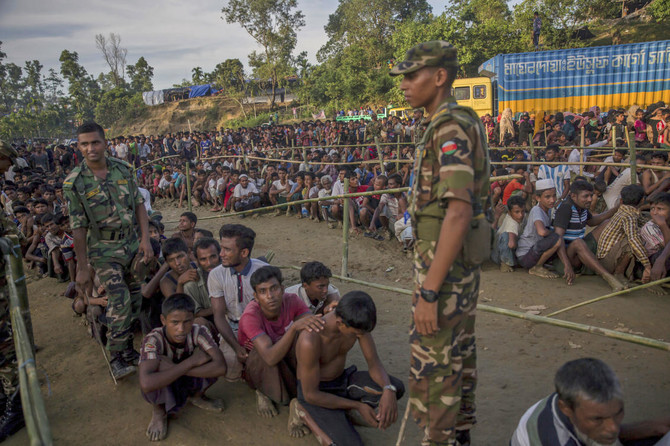 Bangladesh army men stand guard as Rohingya Muslim men, who crossed over from Myanmar into Bangladesh, wait to receive aid during a distribution near Balukhali refugee camp, Bangladesh, Monday, September 25, 2017. (File photo by AP)