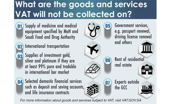 Activities subjected to a zero percent VAT include the supply of medicines and medical equipment specified by the Ministry of Health and the Saudi Food and Drug Authority, the supply of gold and silver for investment purposes provided they are at least 99 percent pure and tradable in the Global Bullion Market, and the export of goods to outside the Gulf Cooperation Council (GCC) region.