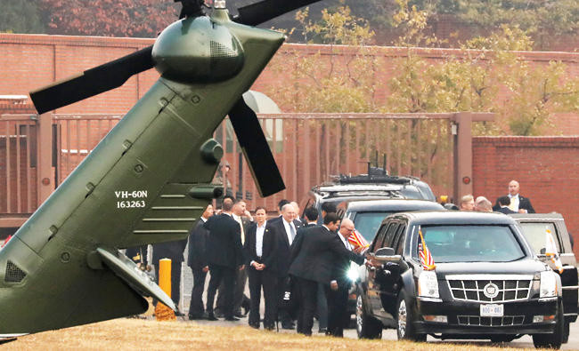 Marine One left Seoul at daybreak and flew most of the way to the DMZ — but was forced to turn back due to poor weather conditions. Weather reports from near the heavily fortified border showed misting conditions and visibility below one mile. Pilots could not see the other helicopters in the air, according to White House officials.