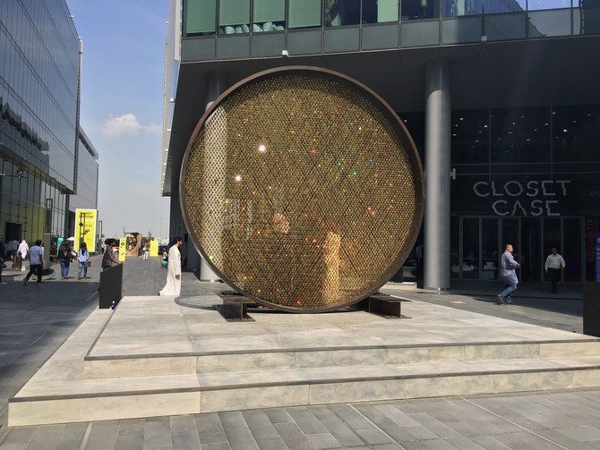 Perhaps the most eye-catching installation, Prologue, designed by Swedish-British duo Fredrikson Stallard and presented by Swarovski, is a monumental, freestanding sculpture weighing 1.2 tons and holding over 8,000 amber-colored Swarovski crystal droplets within its four meter-diameter. The installation is stunning and this is one of the few areas where attendees line up to take pictures. It has been perfectly positioned to revel in Dubai’s sun so that no matter which angle you approach this artwork from, you can see the light dancing around the design.