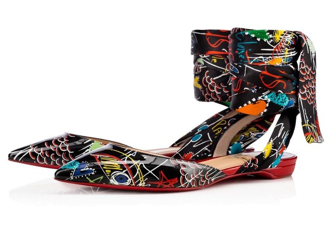 A flat shoe complete with a pointed toe and a wrap-around scarf for the ankle — which one could say resembles a dupatta, or scarf — comes in a classic black and two variations of the designer’s signature scribbles.