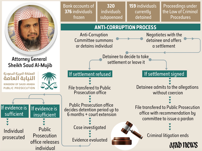 The attorney general said that procedures related to the corruption cases are being carried out in two phases. The first phase, he explained, applies to those who admit to the allegations “freely and without coercion” and is based on the Royal Order’s stipulation that the committee “has the right to decide what it deems as achieving public interest, especially with those who responded positively to the Committee.”