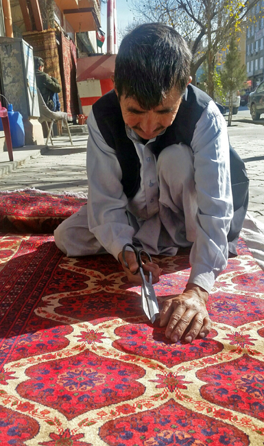 An Afghan carpet seller snips the threads of a carpet in Kabul on Dec.7th.