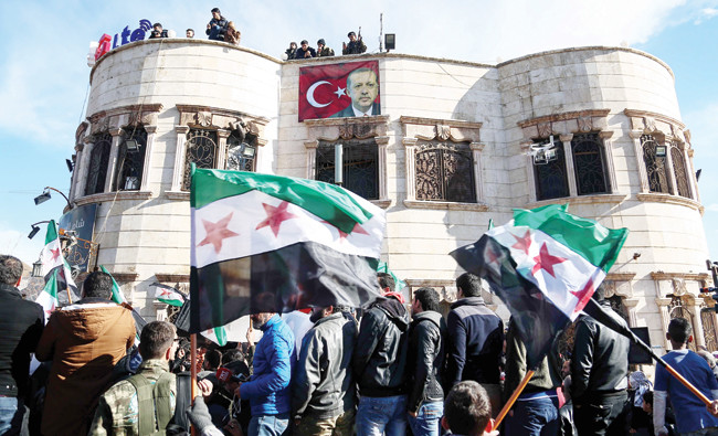 People wave flags during a demonstration in the opposition-held town of Azaz, northern Syria, on Friday, in support of a Turkish military operation in Afrin. (AFP)