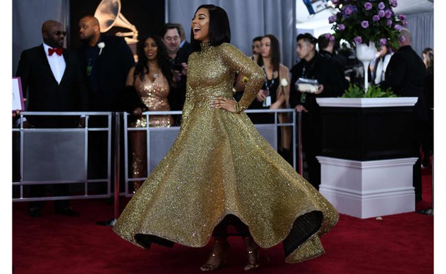 Singer Ashanti sparkled in a gold, long-sleeved Yas Couture by Elie Madi dress.