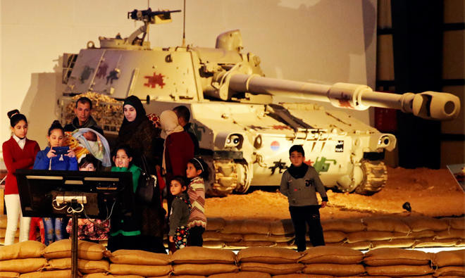 The 20,000-square-meter space also includes exhibits of historic battles in Syria, Jerusalem and Jordan, with loudspeakers blaring gunfire, roars of diesel engines, and fiery patriotic speeches. Life-size replicas of soldiers staff turrets as tank treads menace intricately crafted shrubs.