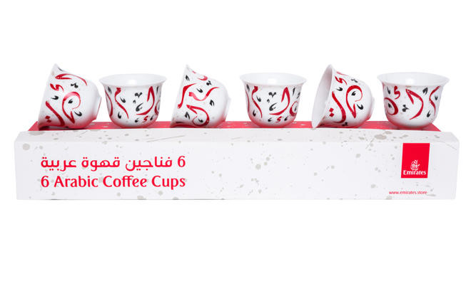 The Arabic coffee cup collection is available at Emirates Official Stores across the UAE as well as online at emirates.store.
