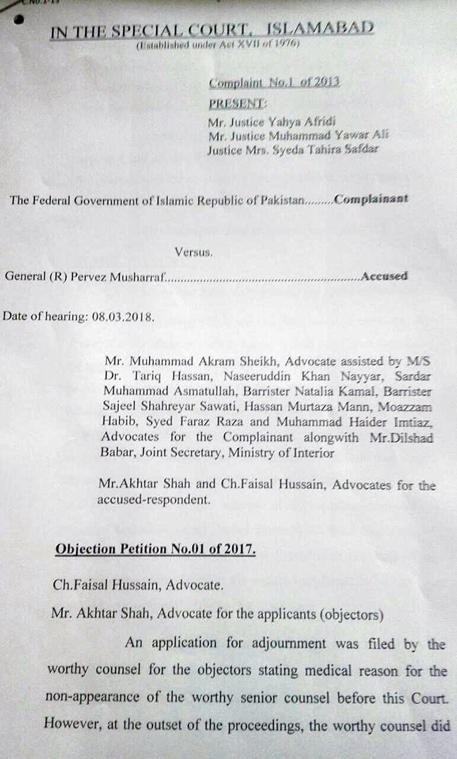 The court was constituted in November 2013 to try Musharraf for imposing a state of emergency in November 2007 when he was president.