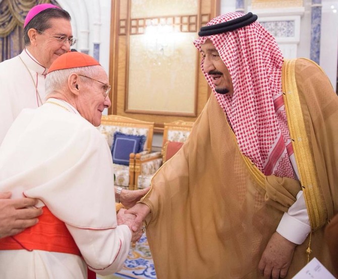 JEDDAH: Saudi Arabia’s King Salman received at his office at Al-Yamamah palace in Riyadh on Wednesday the Chairman of the Pontifical Council for Interfaith Dialogue at the Vatican, Cardinal Jean-Louis Tauran, and his accompanying delegation.