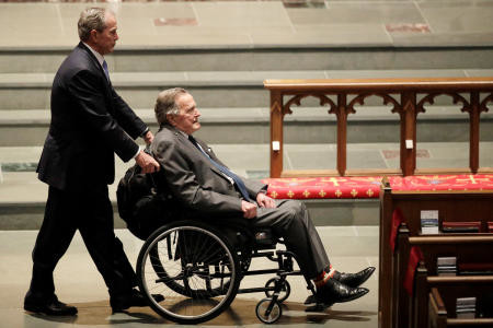 President George H.W. Bush was helped into the cavernous sanctuary with a wheelchair behind his sons, former President George W. Bush and former Florida Gov. Jeb Bush, and other Bush relatives to remember his wife of 73 years who died at their home Tuesday at age 92.