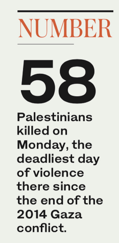 The number of Palestinians killed on Monday reached at least 58, the deadliest day of violence there since the end of the 2014 Gaza conflict.