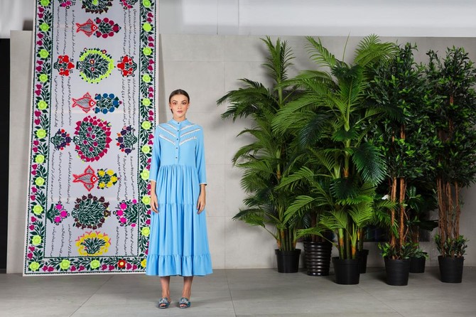 The collection is marked by tiered dresses embroidered with Indian floral folklore motifs, vibrant brocades with contemporary jersey rib details, deliciously bright color block dresses with ruffled halter-necks and detachable off-shoulder sleeves, as well as dresses, tops and bottoms.