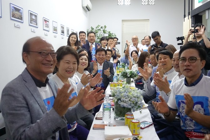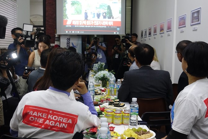 The atmosphere at the Korean Association was upbeat as about 40 South Koreans took time off work to share history in the making. For many, peace on the peninsula appeared a little closer to reality. They practised cheers in Korean, their fists pumping the air, as they urged one another to continue “fighting” — a common word used in South Korean lingo which means “press on.”