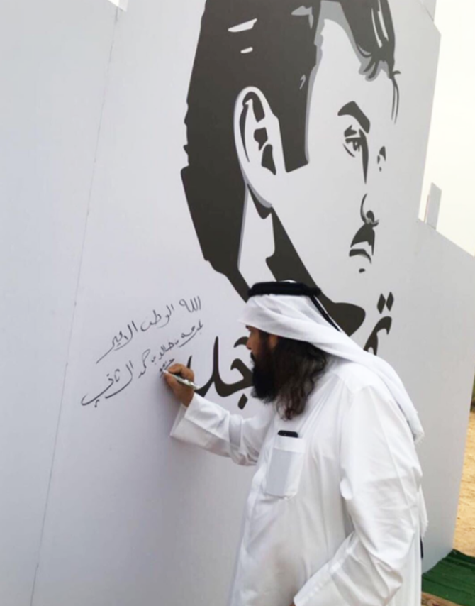 Abdullah bin Khalid Al-Thani was photographed in Doha recently autographing a wall portrait of Qatari Emir Sheikh Tamim bin Hamad Al-Thani.
