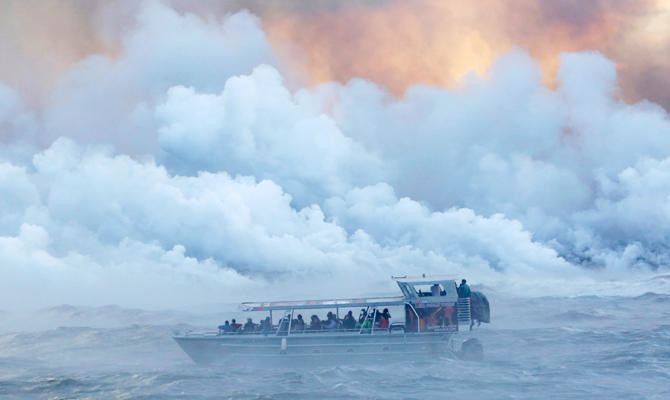 Lava flowing into the Pacific is a spectacular sight, producing a foggy haze known in Hawaii as “laze.”