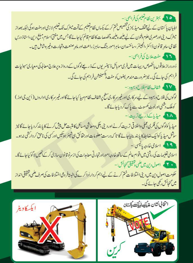 The TLP also promises the “independence of Kashmir and construction of dams” to fulfill the water needs of Pakistan. The top two of its 20-point election manifesto promise implementation of an Islamic system and the establishment of a Muslim alliance for fighting with enemies of Islam.