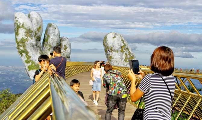 DANANG, Vietnam: Nestled in the forested hills of central Vietnam two giant concrete hands emerge from the trees, holding up a glimmering golden bridge crowded with gleeful visitors taking selfies at the country’s latest eccentric tourist draw.