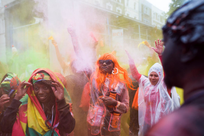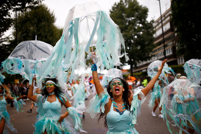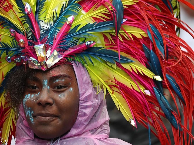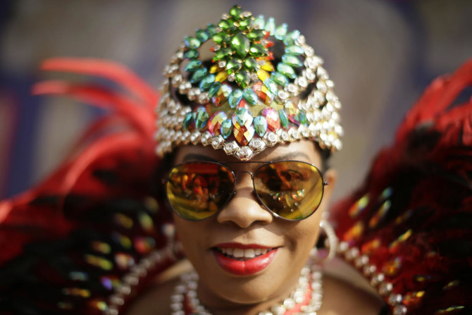 A carnival performer takes part in the parade on the first day of the Notting Hill Carnival in west London on August 26, 2018. Nearly one million people are expected by the organizers Sunday and Monday in the streets of west London's Notting Hill to celebrate Caribbean culture at a carnival considered the largest street demonstration in Europe.