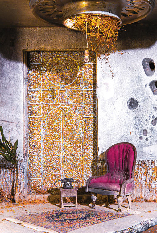 The details he puts into these installations are staggering: Household objects, an abandoned 1970s Volkswagen Beetle, marble pillars, a mosque’s minaret, rawasheen (woodwork), celebratory night lights usually found in neighborhoods, a clothes line hanging outside a balcony and a small outdoor jalsa (seating area).