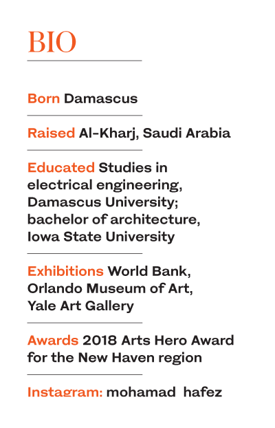 Hafez has recently given a TEDx talk on how he uses his art to defy stereotypes and false perceptions about refugees, migrants and Muslims. He is also the co-founder and curator of the “Unpacked Refugee” initiative, a multimedia installation that seeks to humanize the term “refugee,” where he provided suitcases donated by Americans from the Jewish and Irish immigrant communities in the area. The works tell stories of 10 refugee families, and the suitcases are also scale miniatures telling their stories.