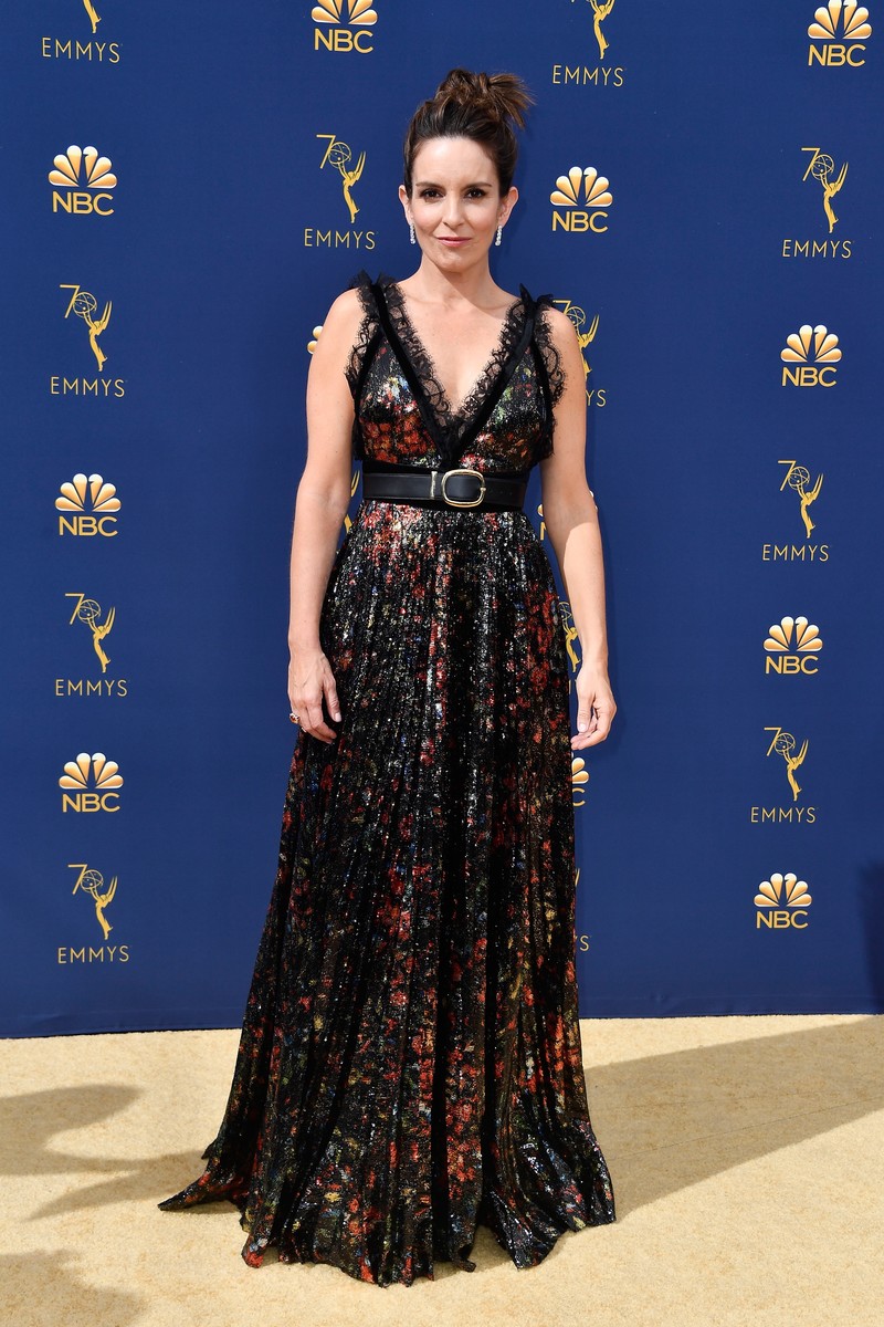 Fey glowed in a floral, lace and velvet gown by Elie Saab, part of his autumn/winter 2018 pret-a-porter collection. The gown featured pleats and a fitted waist in colors perfect for the cold season.