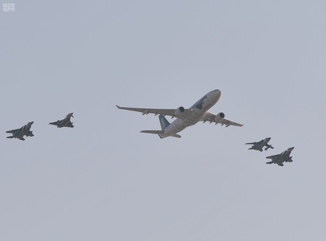 A group of fighter jets — Typhoons, Torinos, F15s, F15Cs and MRTTs — were painted in green and adorned with Saudi Arabian livery and performed a fly-past.