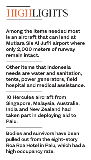 Indonesian officials have said that among the items they need most to distribute humanitarian aid to Palu — the provincial capital — and surrounding districts, is an aircraft that can land at Mutiara Sis Al Jufri airport where only 2,000 meters of runway remain intact.