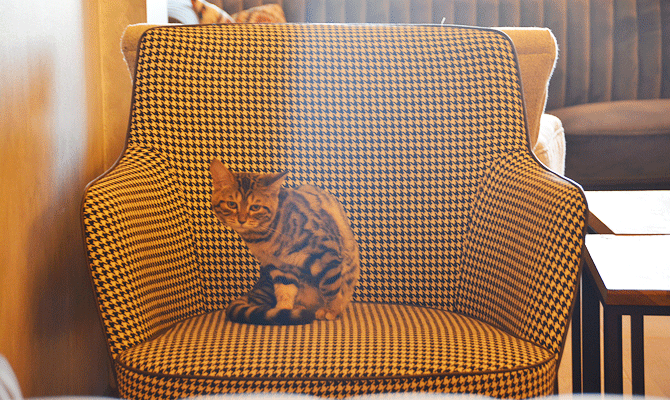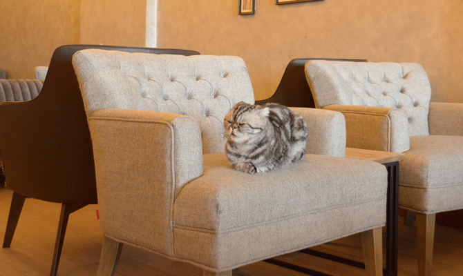 There is also a cozy and relaxing lounge, in every nook and cranny of which you will find more cat-related decorations and trinkets, such as paw prints on the floor and cat silhouettes on the light switches, which show how much thought and effort went into the design and decor of the place.