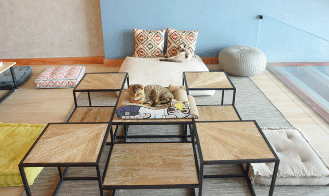 The room where the animals live is perfectly suited to them, with cat trees, scratching posts and panels on the wall for them to climb and clamber on. One end of the lounge has floor-to-ceiling glass windows and hammocks in which the cats can relax and enjoy the sea view. What inspired Mohammed to open such an unusual cafe?