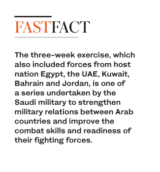 The three-week exercise, which also included forces from host nation Egypt, the UAE, Kuwait, Bahrain and Jordan, is one of a series undertaken by the Saudi military to strengthen military relations between Arab countries and improve the combat skills and readiness of their fighting forces.
