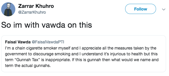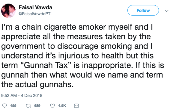 ‘I’m a chain cigarette smoker myself and I appreciate all the measures taken by the government to discourage smoking and I understand it’s injurious to health but this term “Gunnah Tax” is inappropriate,” he tweeted. “If this is gunnah then what would we name and term the actual gunnahs.”