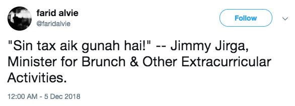 "Sin tax aik gunah hai!’ -- Jimmy Jirga, Minister for Brunch & Other Extracurricular Activities,” Alvie posted.