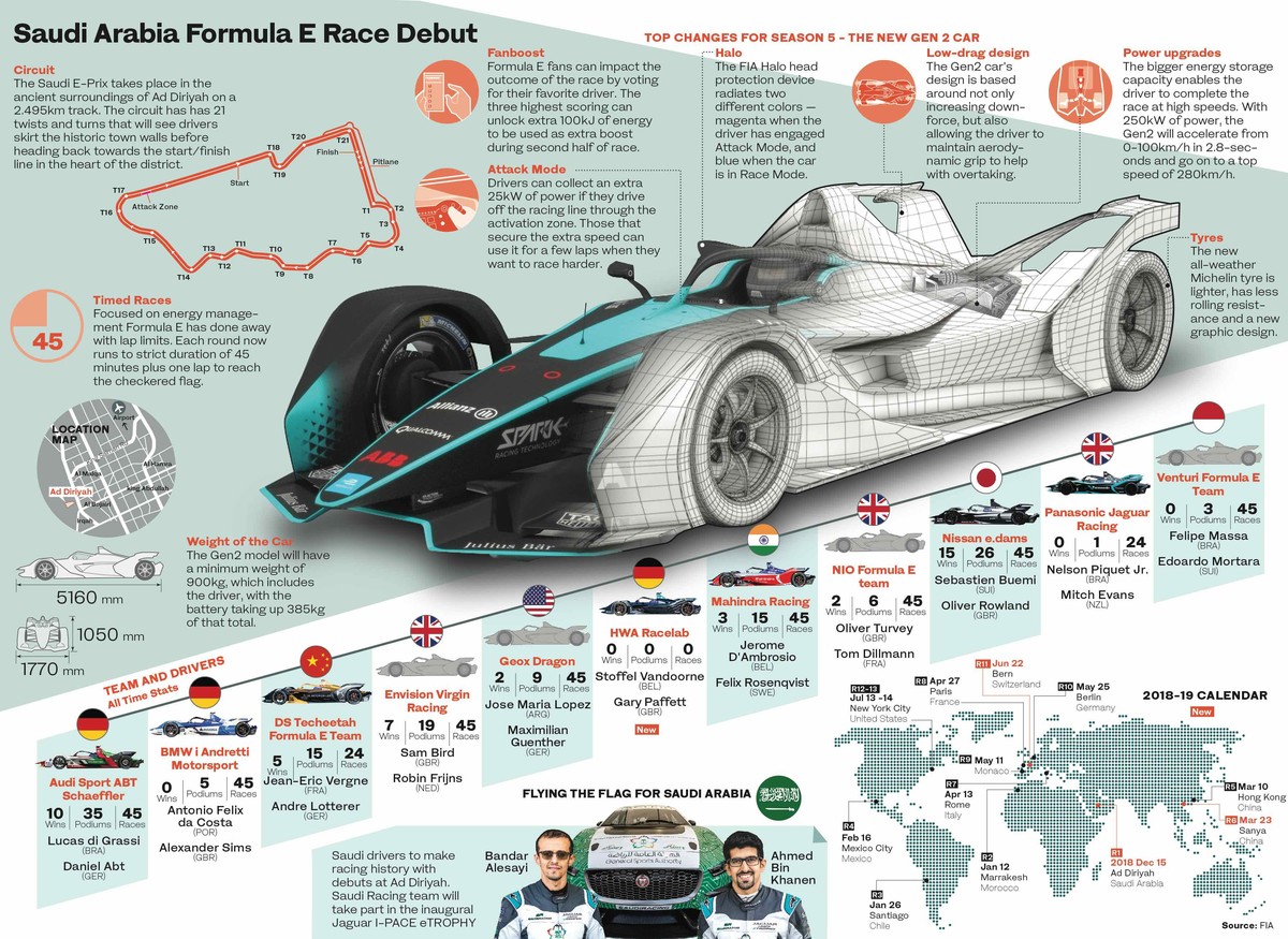 “Saudi Arabia is racing into the future with Formula E, as we open the Kingdom to the world in a transformation that’s being supercharged by the Vision 2030 plan, driven forward by Crown Prince Mohammed bin Salman,” Prince Abdul Aziz bin Turki Al-Faisal Al-Saud, vice-chair of the Saudi Arabian General Sports Authority, told Arab News.