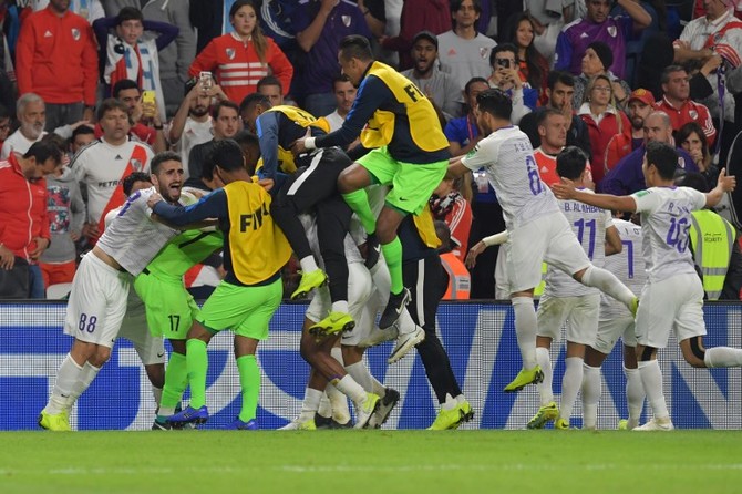 Al-Ain players celebrate after their shock win over River Plate that took them to Saturday's final against Real Madrid.