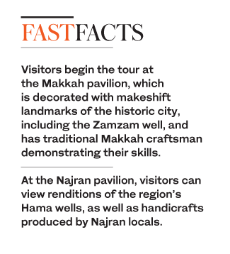 Visitors begin the tour at the Makkah pavilion, which is decorated with makeshift landmarks of the historic city, including the Zamzam well, and has traditional Makkah craftsman demonstrating their skills.