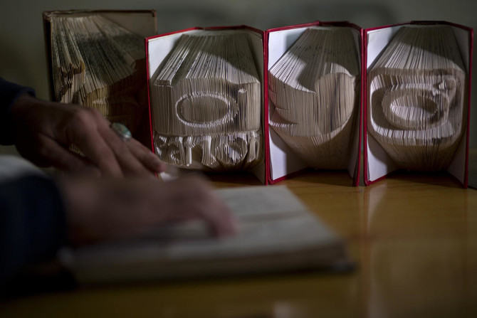 Humaid practices a form of origami in which he folds and forms the pages of an entire book into a readable inscription of calligraphic letters.