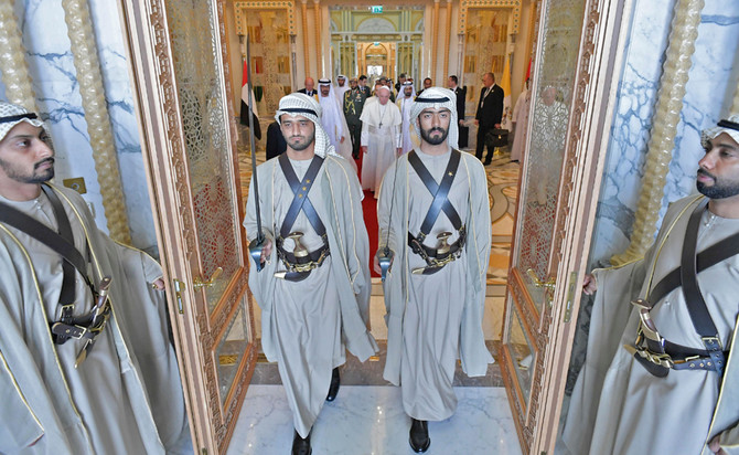 There was a military band, and members of the UAE army, before jets flew above leaving a trail of yellow and white smoke — the colors of the Vatican flag — and a 21-gun salute echoed from behind the palace.